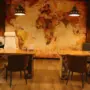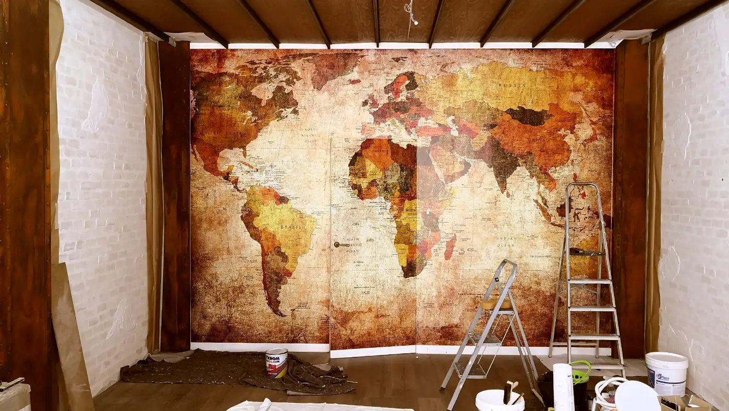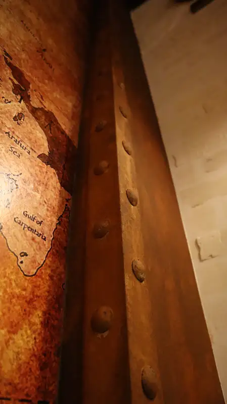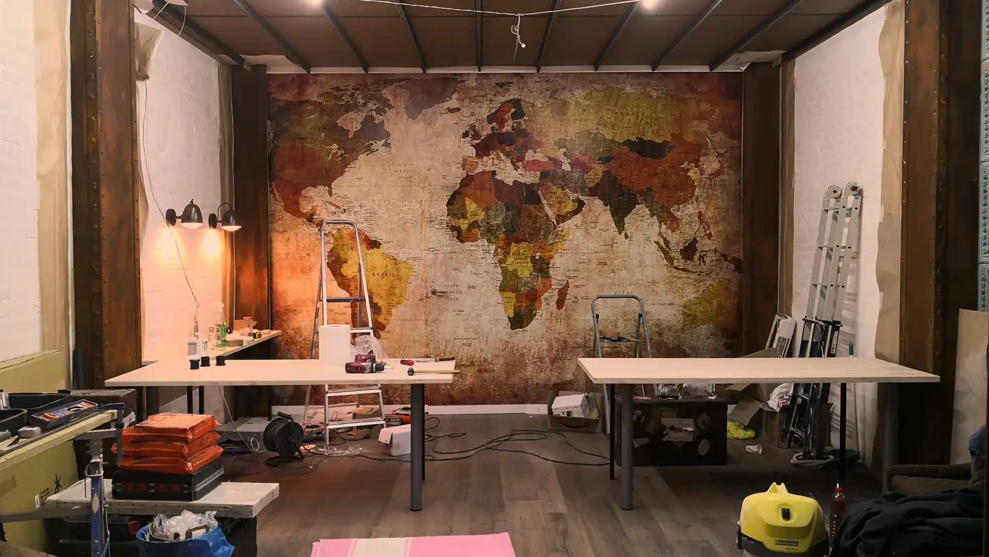 El mapa mural era estrecho; le faltaban 25 centímetros a cada lado. Podríamos haberlo pintado de negro o parcheado, pero el espacio pidió otra cosa. Creé otras dos columnas imitando acero antiguo oxidado y remachado. Lo que nació como un problema técnico se convirtió en el elemento que más presencia y solidez aporta al conjunto.