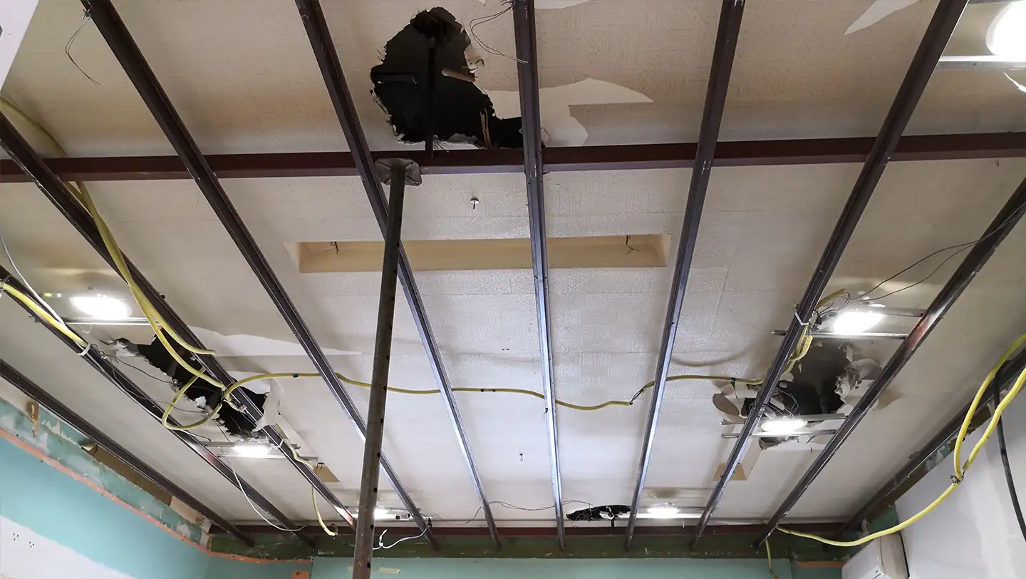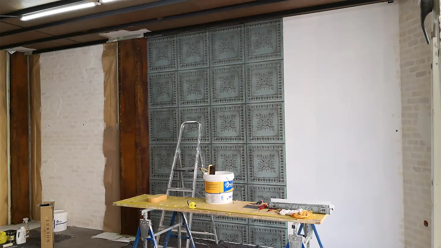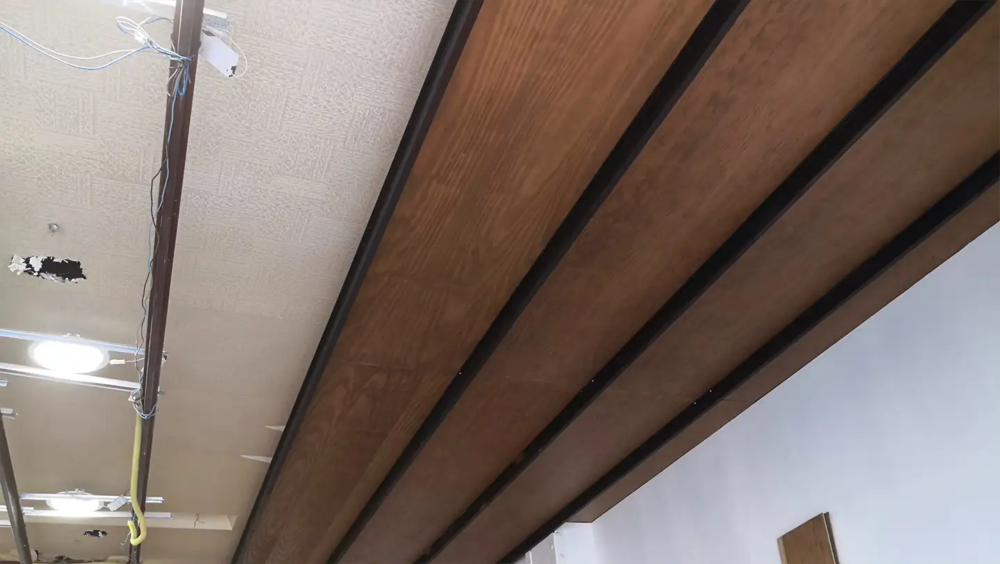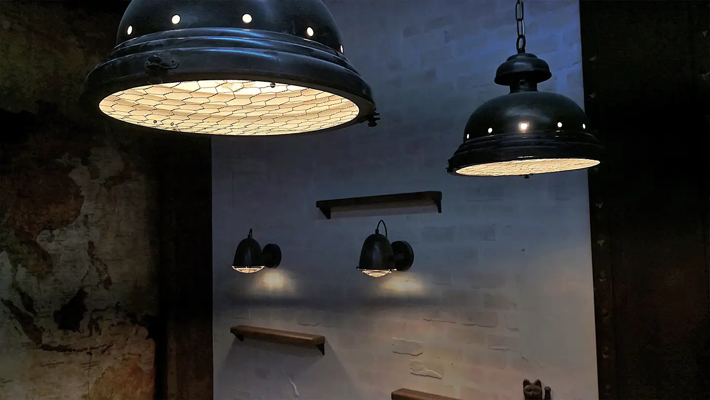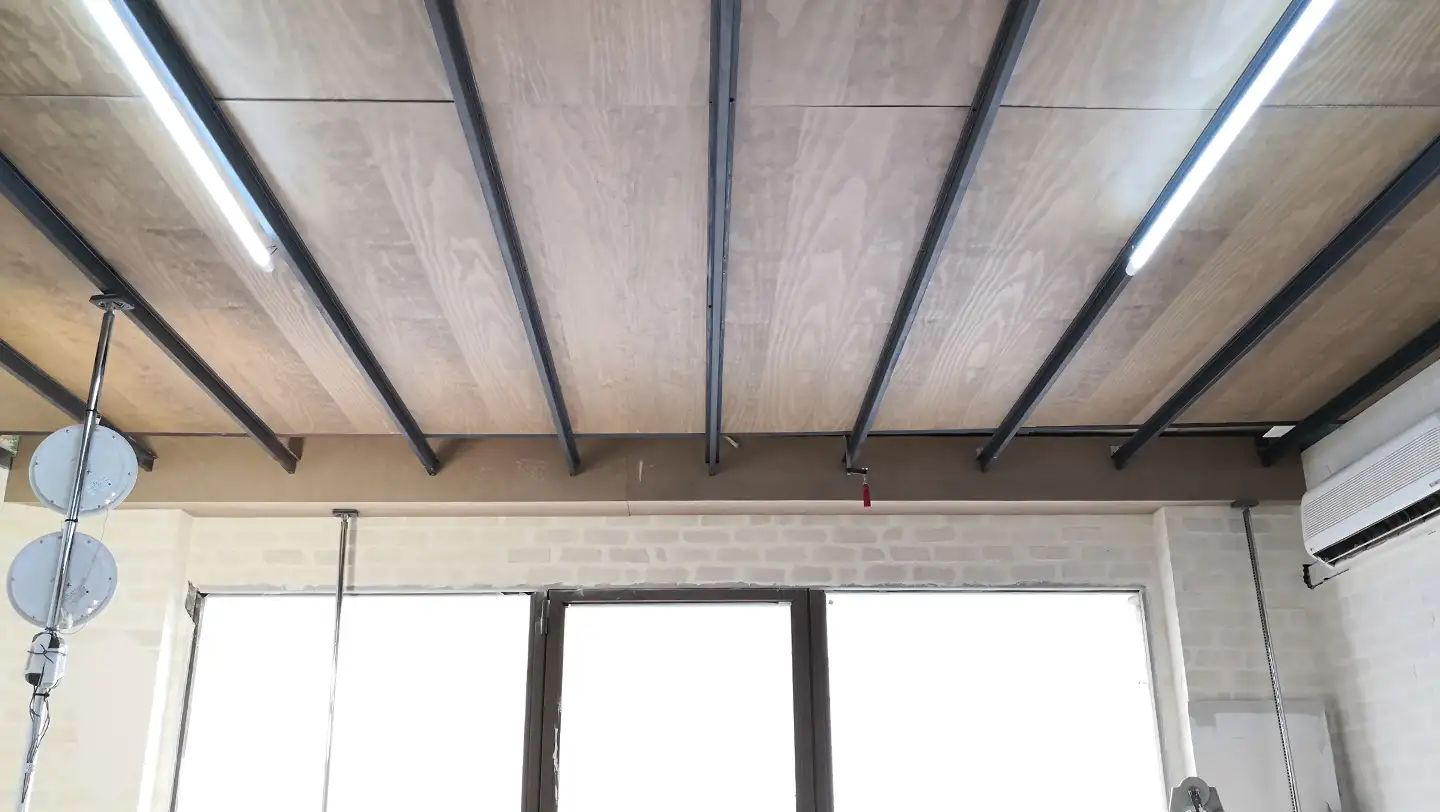 Desmontamos el falso techo y apareció una estructura metálica descolgada y dañada. La recuperamos, la reforzamos y la vestimos con madera teñida a mano en más de veinte pruebas de color hasta dar con el tono exacto. Cambiamos la fría y blanca luz downlight por la calidez de lámparas vintage restauradas con malla de gallinero y luz de carbono.
