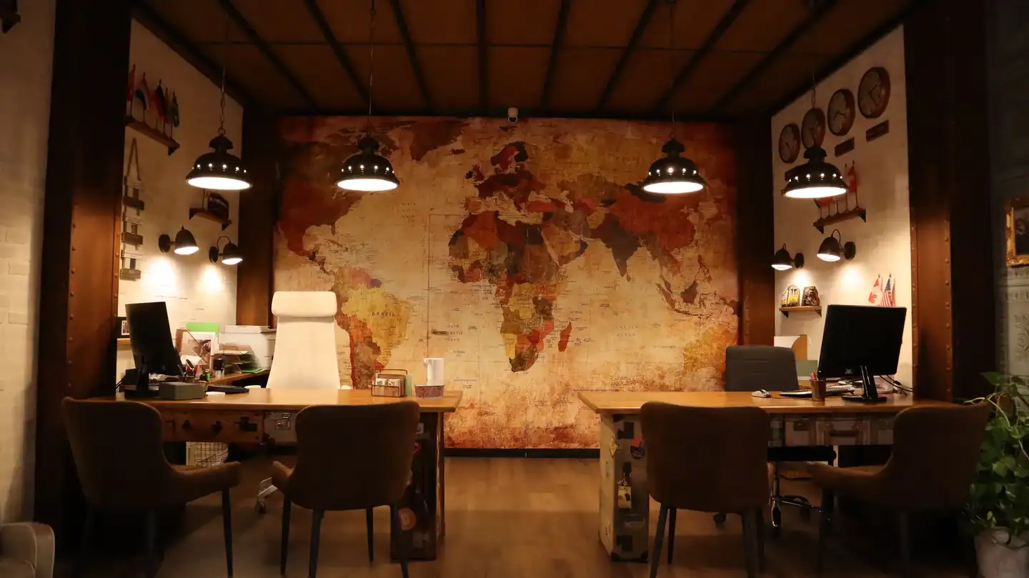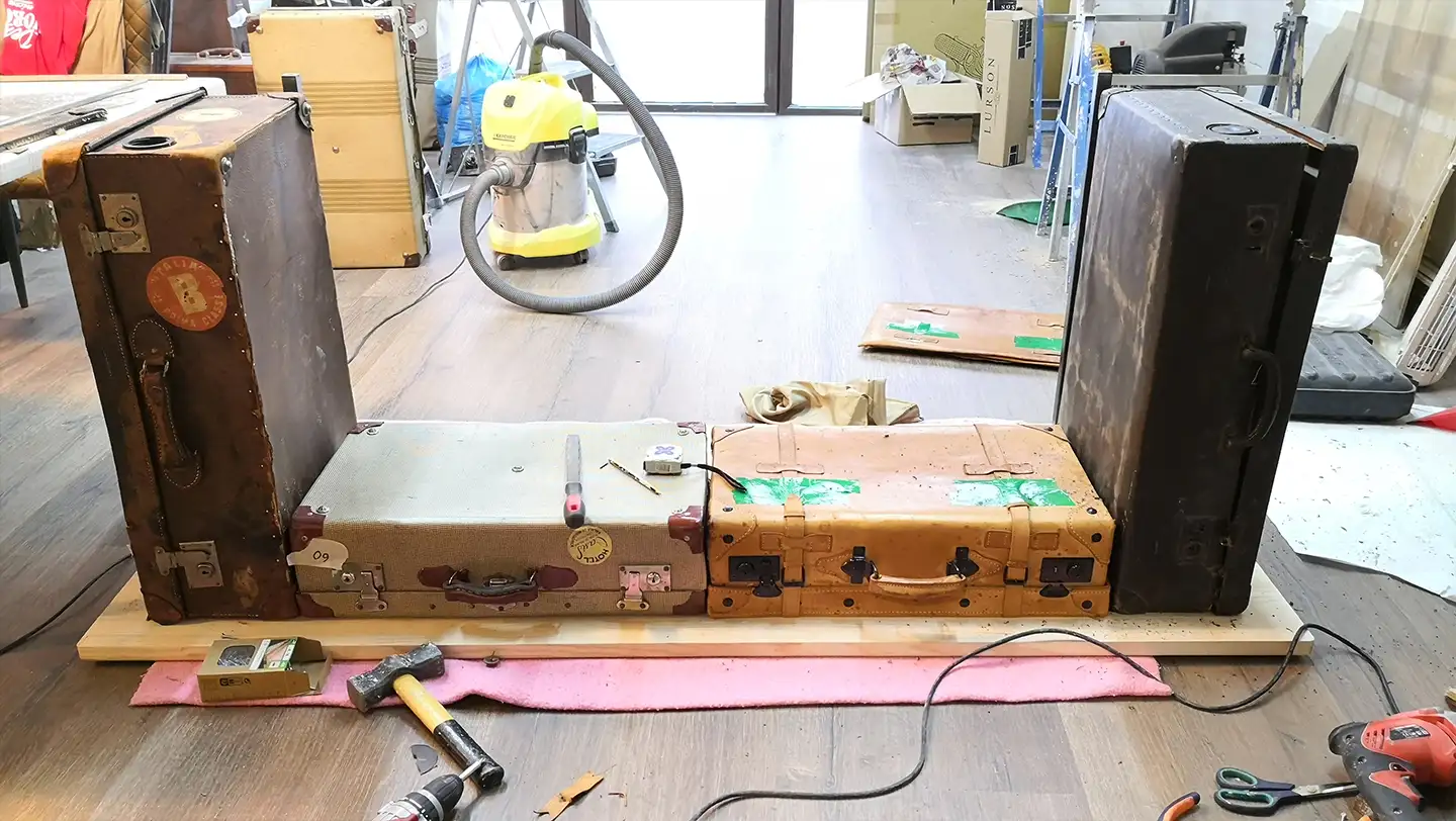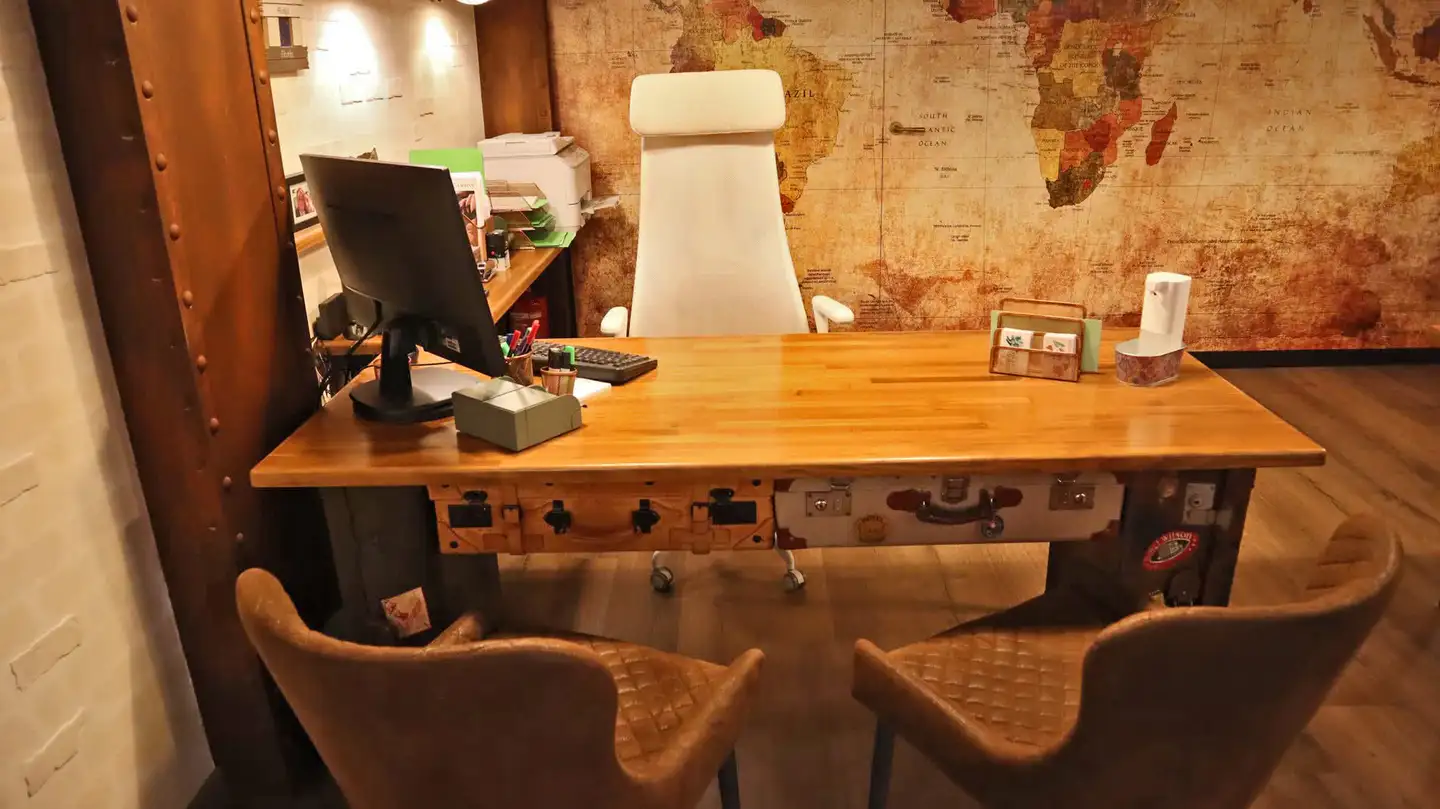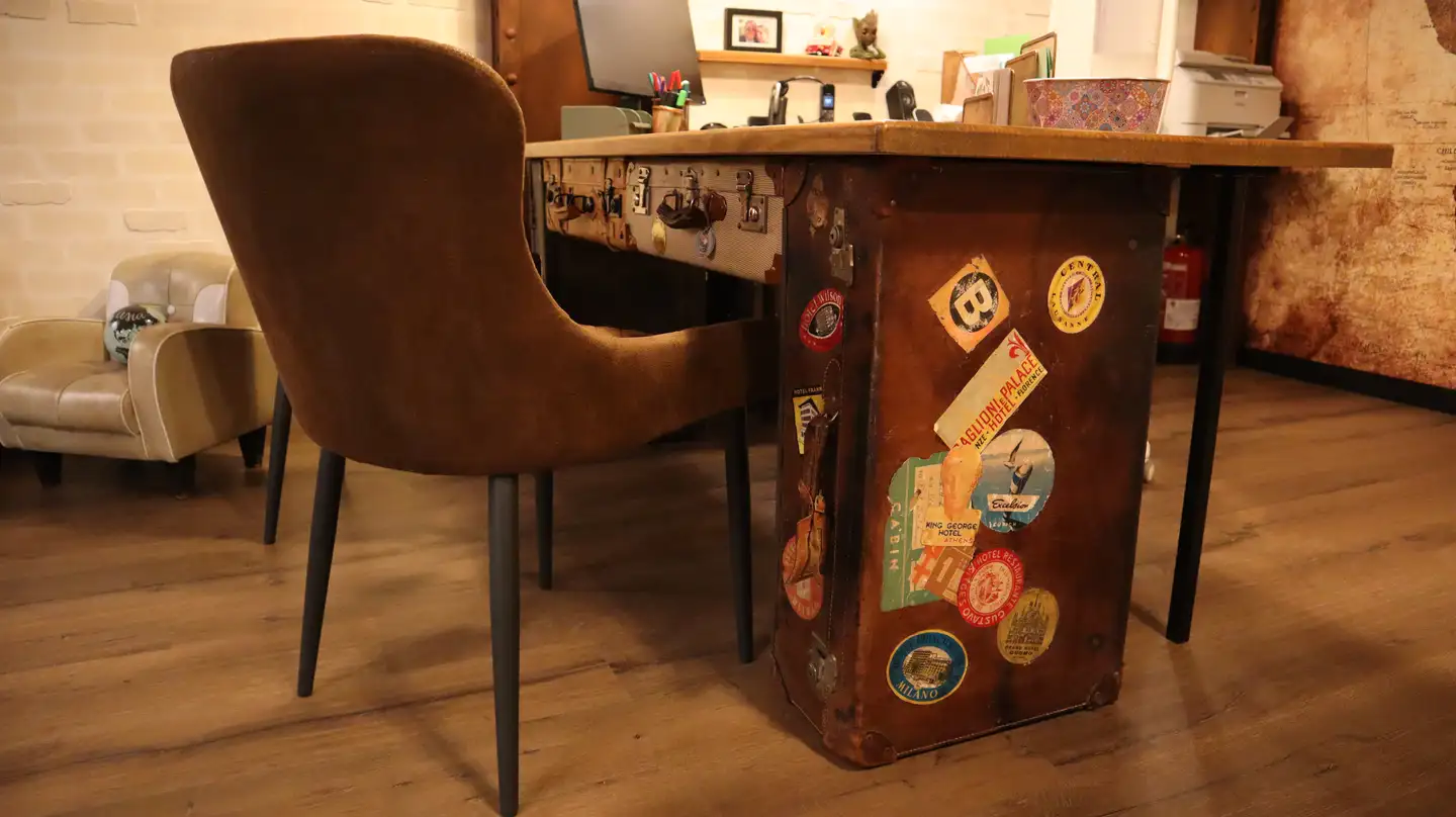 No quería mesas de oficina. Quería que la conversación sucediera sobre el viaje mismo. Buscamos maletas antiguas reales, con pegatinas que firmasen multitud de viajes, las restauramos y las convertí en escritorios funcionales con estructura de hierro oculta. Ahora, cuando te sientas, literalmente te apoyas sobre viajes e historias.